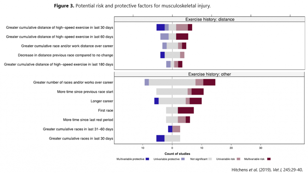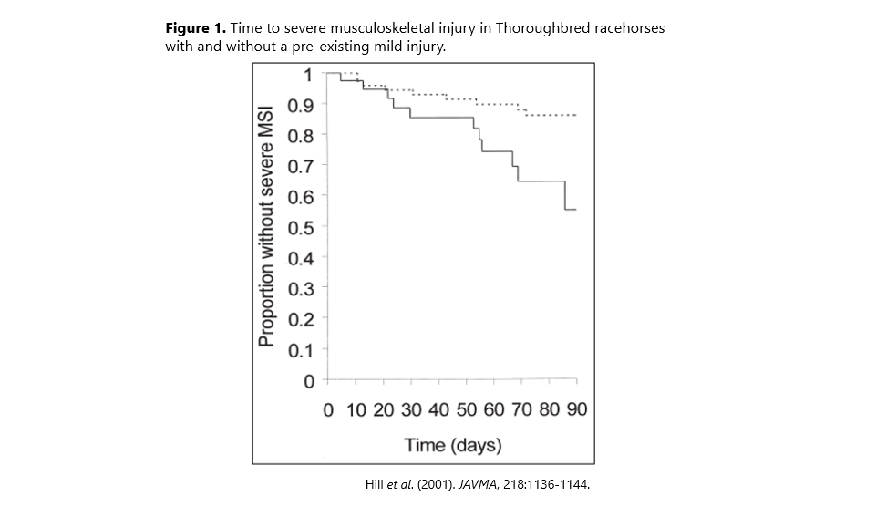 For many years, when human athletes had minor musculoskeletal complaints (i.e. “niggles”), it was generally considered they could – and should – continue training. However, it was recently shown that minor complaints experienced by athletes were associated with deleterious effects on participation, performance, and training volume. These minor complaints were also associated with a greater severity of future complaints (14). Similar findings have been documented in high performance horses, with researchers demonstrating that horses with mild injury were significantly more likely to experience a major musculoskeletal injury (Figure 1) (5).