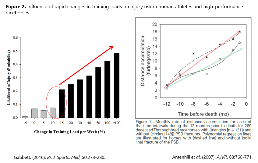 When a tissue is exposed to a load that far exceeds its capacity to adapt, or when training load is progressed rapidly (4), injury risk increases. This finding, which has been extensively documented in humans, has also been observed in high performance horses. Munsters et al. (12) demonstrated that rapid changes in training load relative to capacity, increased the risk of injury in eventing horses. Antenhill et al. (1) also showed that thoroughbred racehorses that died due to musculoskeletal injury accumulated greater distance in the 12 months before death, than horses that died without musculoskeletal injury (Figure 2).