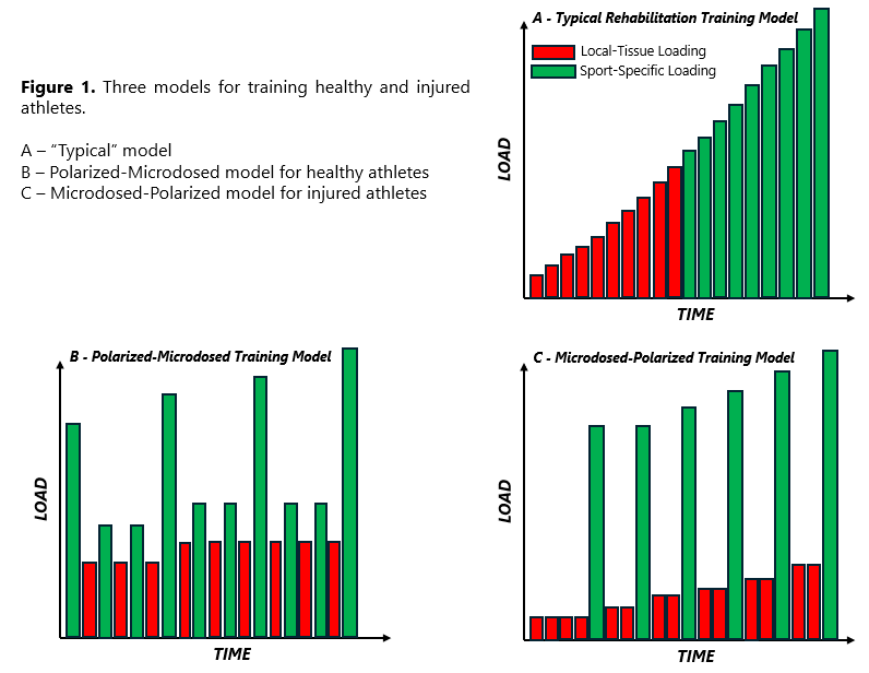 Rather than relying solely on local-tissue loading in rehabilitation, a microdosed-polarized model is recommended. Of course, the emphasis is on restoring capacity of the injured tissue using a microdosed approach because the injured tissue cannot tolerate high intensities, but judicious use of global capacity loading should be performed around the injury. The athlete already has one problem (i.e. the injured tissue) – we don’t want to create another problem by allowing the capacity of other non-injured tissues and systems to also decrease. As long as the inflammatory response to rehabilitation is not exacerbated, this loading can be started almost immediately after injury and can follow a polarized training model (Figure 1c). This approach offers an evidence-based, best practice approach to bridging the gap between injury and return-to-peak performance.